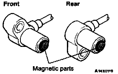 1) Check whether any metallic foreign material has adhered to the parts shown in the illustration at the speed sensor tip, and it so, remove it.
