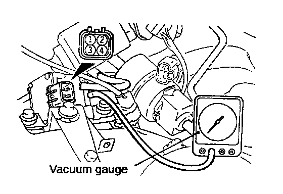 5. In this condition, check to be sure that the vacuum gauge shows a 20 kPa (150 mmHg, 6 in.Hg) or less when terminals (2) and (3) are disconnected from the battery.