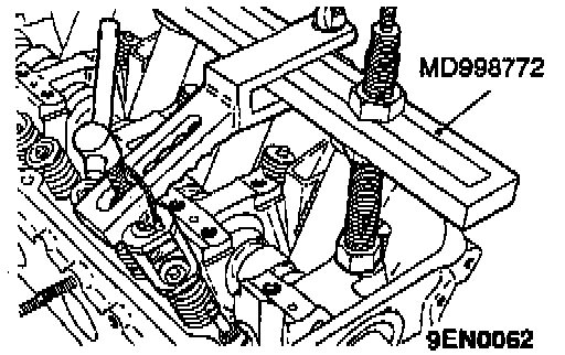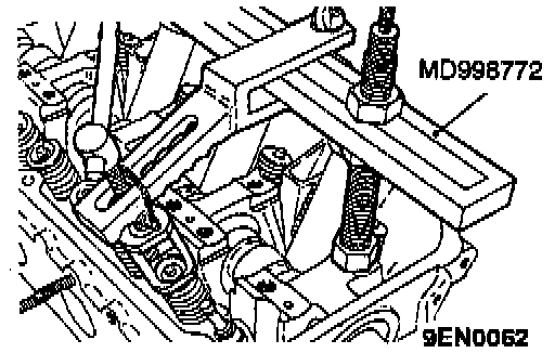 (1) Before removing rocker arms and shafts assembly, install the special tool as illustrated to prevent adjuster from dropping.