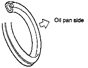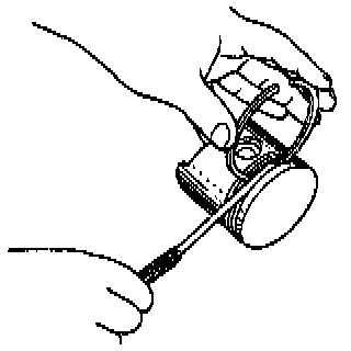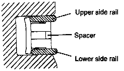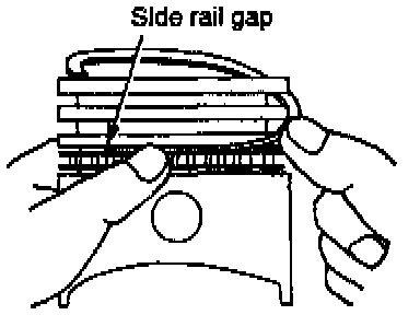 (2) Install the upper side rail. To install the side rail, first fit one end of the rail into the piston groove, then press the remaining portion into position by finger. See illustration. Use of ring expander to expand the side rail end gap can break the side rail, unlike other piston rings.