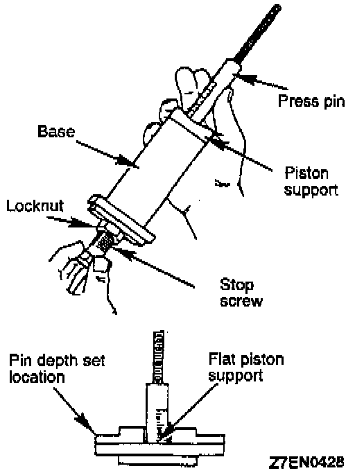 (1) Thread the stop screw and lock nut assembly into the base. Fit the correct piston support on top of the base. Insert the press pin, threaded end up, into the hole in the piston support until the press pin touches the stop screw.