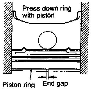 (3) Install the piston ring into the cylinder bore. Force it down with a piston, its crown being in contact with the ring, to correctly position it at right angles to the cylinder wall. Then, measure the end gap with a feeler gauge. If the ring gap is excessive, replace the piston ring.