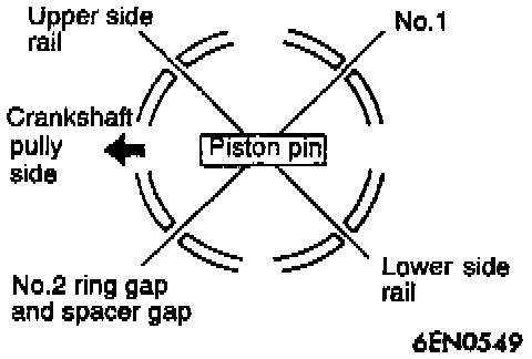 (2) Arrange the piston ring and oil ring gaps (side rail and spacer) as shown in the figure.