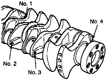 (1) Measure the crankshaft pin diameter and confirm its classification from the following table. in the case of a crankshaft supplied as a service part, identification colors of its pins are painted at the positions shown in the illustration.