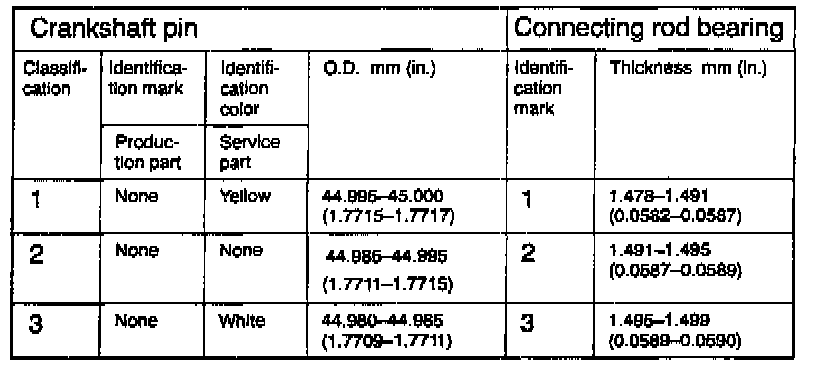 (1) If the measured value of a crankshaft pin outer diameter is between 44.995 and 45.000 mm (1.7715 and 1.7717 inch), the pin is classified as "1," in the table. In case the crankshaft is also replaced by a spare part, check the identification colors of the pins painted on the new crankshaft. If the color is yellow, for example, the pin is, classified as "1". In the above cases, select the connecting rod bearing having identification mark"1".
