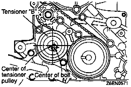 (3) Make sure that the relationship between the tensioner pulley center and the bolt center is as shown in the illustration.