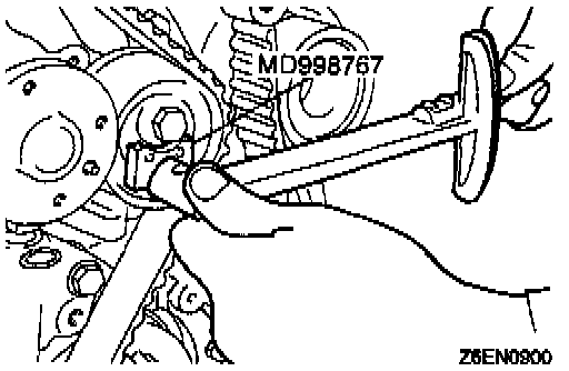 (13) Holding the tensioner pulley with the special tool and torque wrench, tighten the center bolt to specification.