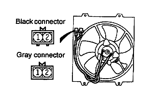 2. In this same condition, apply battery (+) voltage to terminal 1 of the black connector and grounded terminal 2. Check to be sure that the condenser fan motor operates faster at this time.