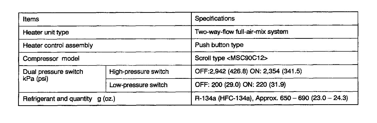 The A/C system is basically the same as the manual air conditioning in which a new refrigerant system has been adopted. However, an A/C control panel with a reduced number of buttons and a more compact arrangement of necessary functions owing to more functions being assigned to each button has been adopted.
