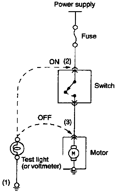 3. Then, connect the test light or voltmeter to the motor connector. The test light should not come on, or the voltmeter should indicate no voltage. When the switch is turned on in this state, the test light should come on, or the voltmeter should indicate a voltage, with motor starting to run.
