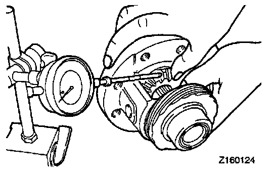 3. Measure the backlash between the side gear and pinion gear. The backlash should be 0.025 to 0.150 mm (0.00098 to 0.00591 inch) and the right and left gear pairs should have equal backlash. If the backlash is not within the standard value, disassemble, and reassemble them using spacers selected for correct backlash.