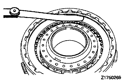Check clearance between the snap ring and clutch reaction plate. To check the clearance, hold entire circumference of the clutch reaction plate down with 50 Nm (11 lbs.) force. If clearance is out of standard value, select a snap ring to obtain the standard value.