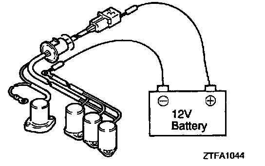 3. Connect a 12V battery between lithe terminal and body of each solenoid valve and check the operating sound. The valve is okay if an operating sound is heard. No operating sound indicates that the valve is sticking or has accumulated foreign matter. In this case, replace the solenoid valve assembly.