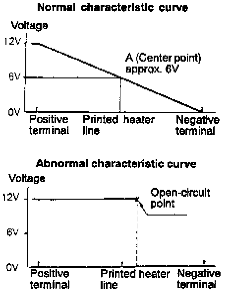 2. Turn ON rear window defogger switch. Measure heater element voltage with voltmeter at rear window glass centre A.