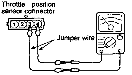 (2) Connect an ohmmeter between terminal 3 (closed throttle position switch) and 4 (sensor ground) by using jumper wires.