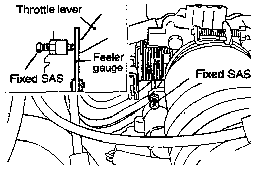 2. Insert a feeler gauge with a thickness of 0.65 mm (0.0256 in.) between the fixed SAS and the throttle lever.