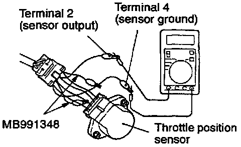 (2) Connect a digital-type voltmeter between the throttle position sensor terminal 2 (sensor output) and terminal 4 (sensor ground.)