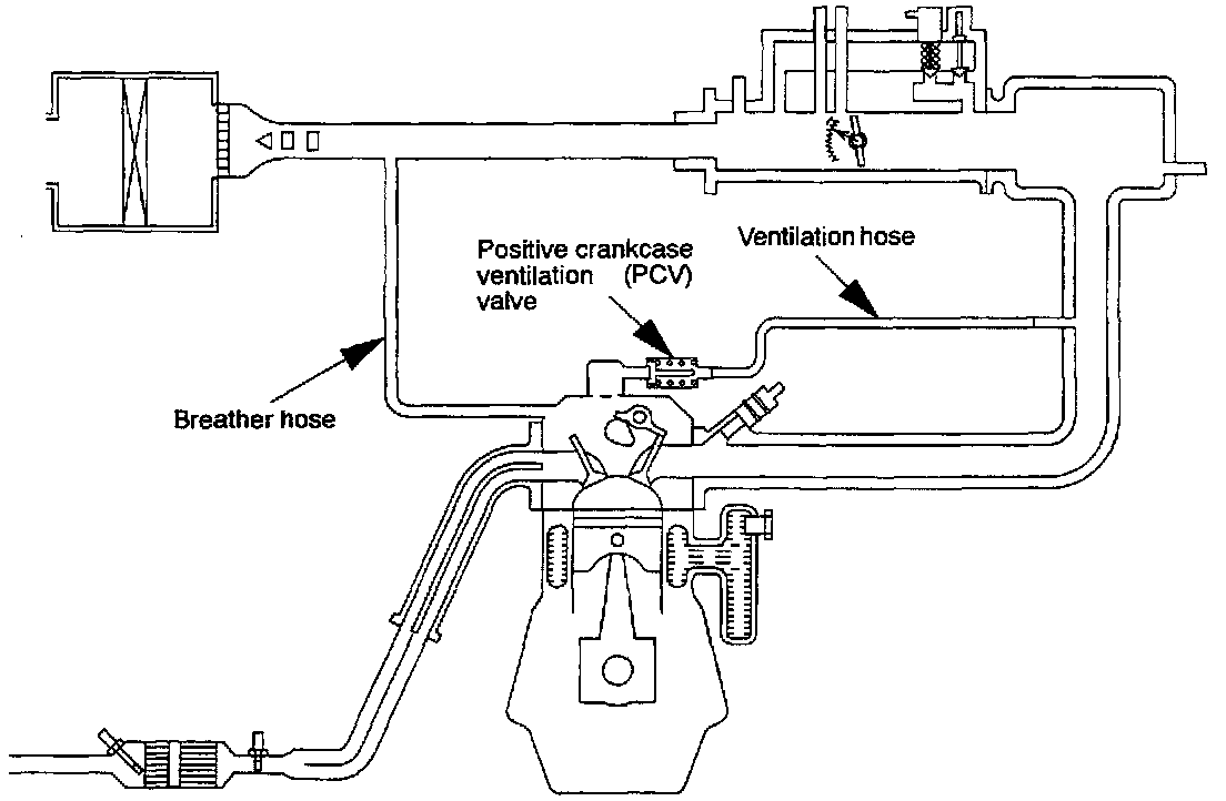 The positive crankcase ventilation system is a system for preventing the escape of blow-by gases from inside the crankcase into the atmosphere. Fresh air is sent from the air cleaner into the crankcase through the breather hose to be mixed with the blow-by gases inside the crankcase. The blow-by gas inside the crankcase is drawn into the intake manifold through the positive crankcase ventilation (PCV) valve.