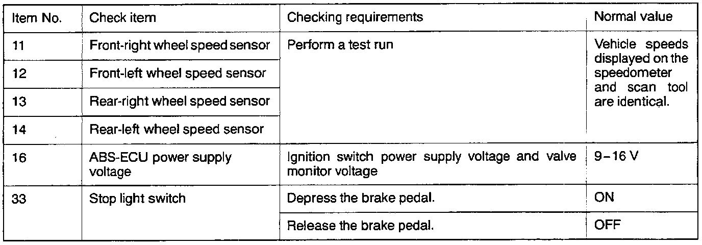 The following items can be read by the scan tool from the ABS-Electronic Control Unit (ECU) input data.1. When the system is normal.