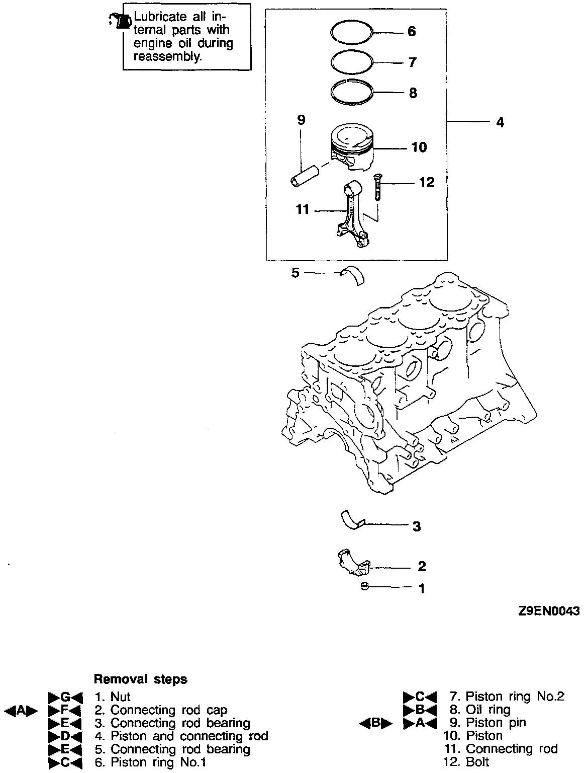 3. With the piston crown's front arrow mark pointing toward the timing belt side, press the piston and connecting rod assembly into the cylinder from the top of the cylinder.
