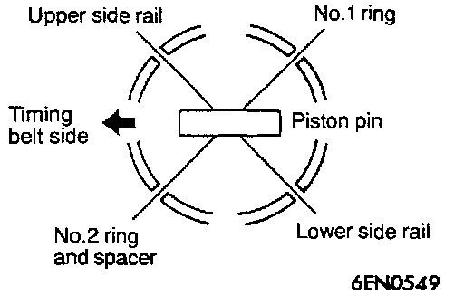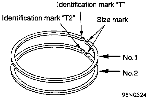 1. Using a ring expander, fit ring No.2 and ring No.1 with their identification marks facing upward (on the piston crown side).