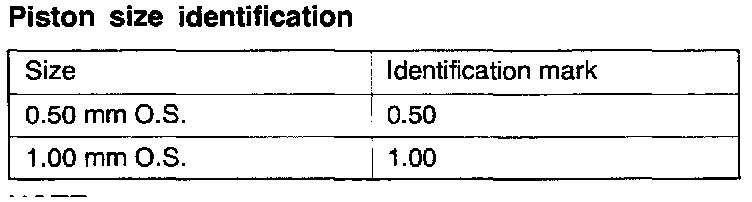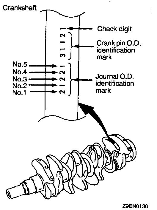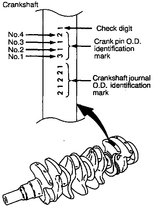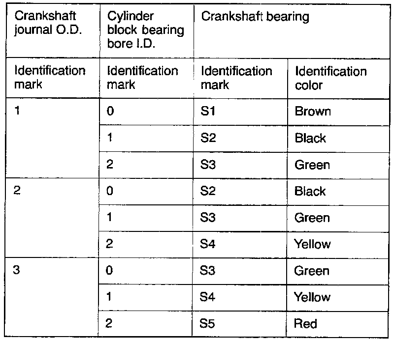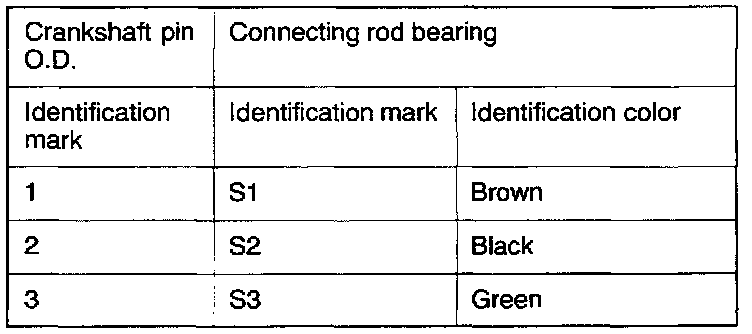 1. When replacing the bearings and/or crankshaft, read off the identification mark on the crankshaft, and select a bearing according to the following table.