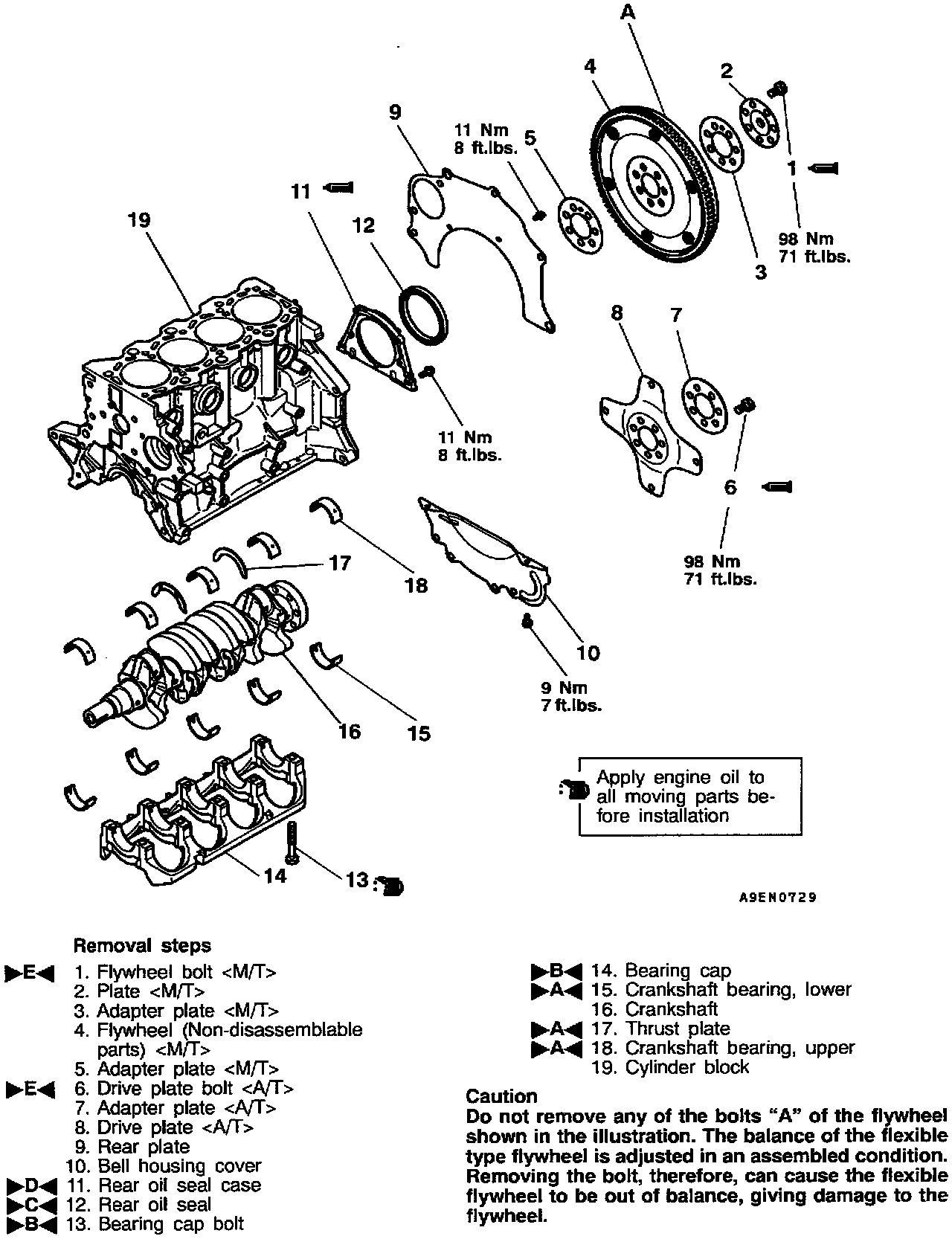 CAUTION: Do not remove any of the bolts "A" of the flywheel shown in the illustration. The balance of the flexible type flywheel is adjusted in an assembled condition. Removing the bolt, therefore, can cause the flexible flywheel to be out of balance, giving damage to the flywheel.