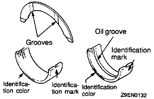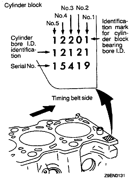 1. When replacing the bearings, crankshaft and/or cylinder block, read off the identification mark on the crankshaft and cylinder block (as illustrated), and select a bearing according to the following table.