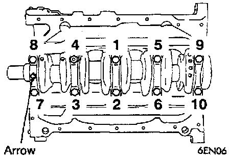 4. Tighten the bearing cap bolts to 25 Nm (18 ft. lbs.) torque in the sequence shown.