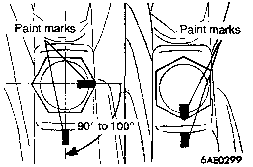 7. Give a 90° to 100° turn to the nut and make sure that the paint mark on the nut and that on the bolt are in alignment.