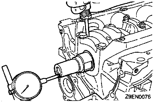 9. Measure the end play in the crankshaft. If the measurement exceeds the specified limit, replace the crankshaft bearings.