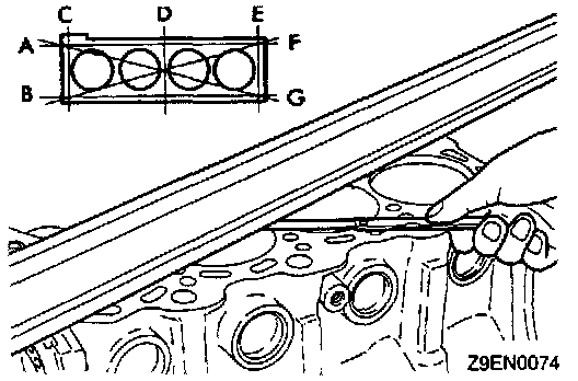 2. Ensure that the top surface is free of gasket chips and other foreign material. Check the cylinder block top surface for distortion using a straight edge and feeler gauge.