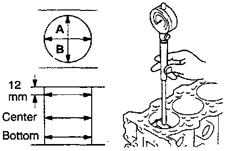 5. Using a cylinder gauge, measure each cylinder bore and cylindricity. If any cylinder is severely worn, bore all the cylinders to oversize and replace the piston and piston rings accordingly. Take measurements at the points shown.