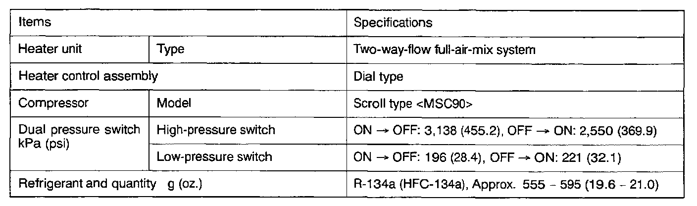 The A/C system is basically the same as the conventional system, but a new refrigerant system has been adopted as a response to restrictions on the use of chlorofluorocarbons.