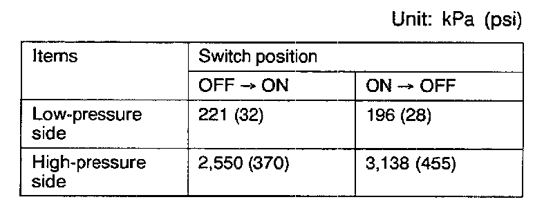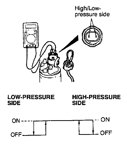 3. When the high/low-pressure sides of the dual pressure switch are at operation pressure (ON) and there is continuity between the respective terminals, then the condition is normal. If there is no continuity, replace the switch.