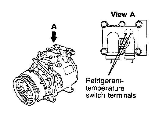 When the A/C is off, check that there is continuity between the refrigerant-temperature switch terminals. If no, replace the compressor assembly.
