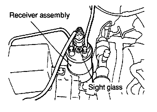 The sight glass is a refrigerant level indicator. To check the refrigerant level, clean the sight glass and start the vehicle engine. Push the A/C button to operate the compressor, place the blower switch to high and move the temperature control lever to max cool. After operating for a few minutes in this manner, check the sight glass.