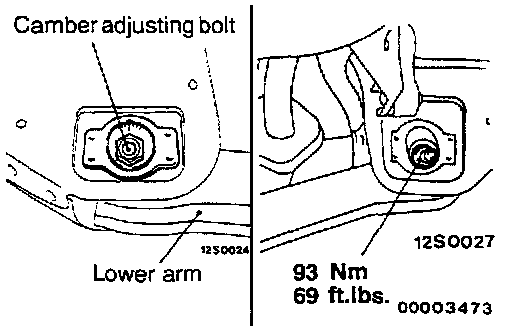 2. Adjust by turning the camber adjusting bolt (mounting bolt for the lower arm and rear crossmember).