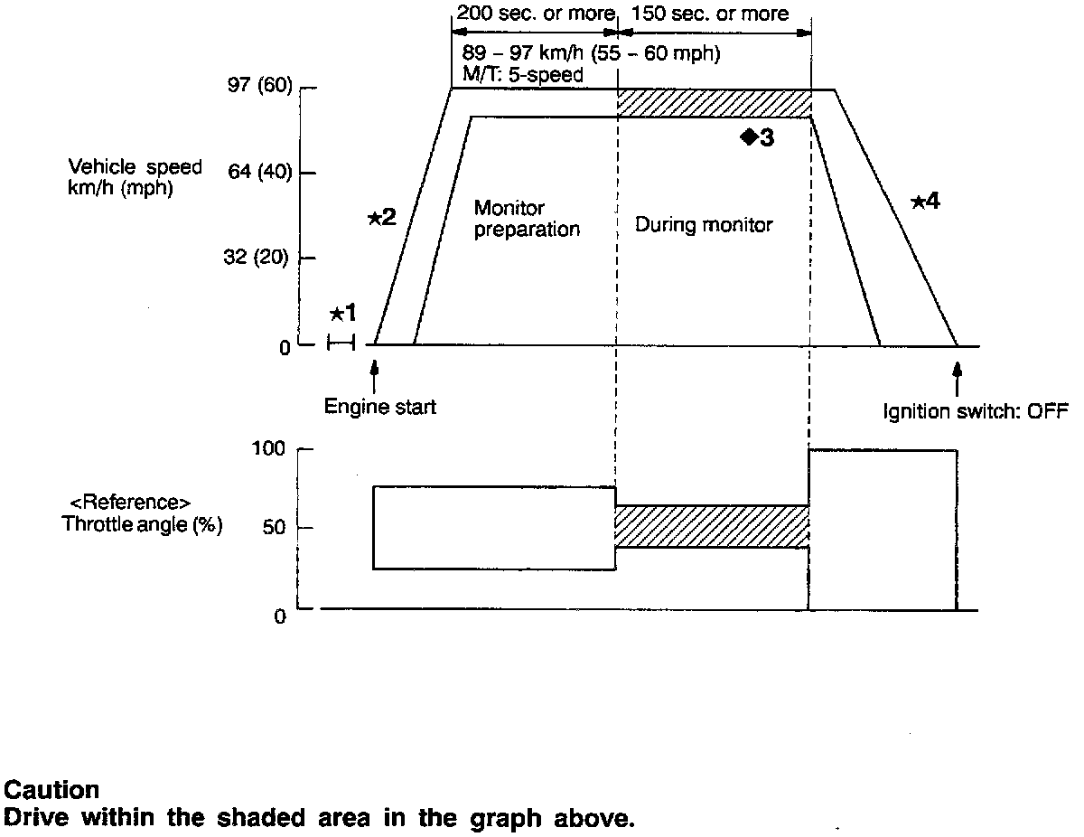 *2: Monitor preparation period; Start the engine and accelerate to 89 - 97 kin/h (55 - 60 mph). For this period, acceleration, deceleration, or braking may be carried out.