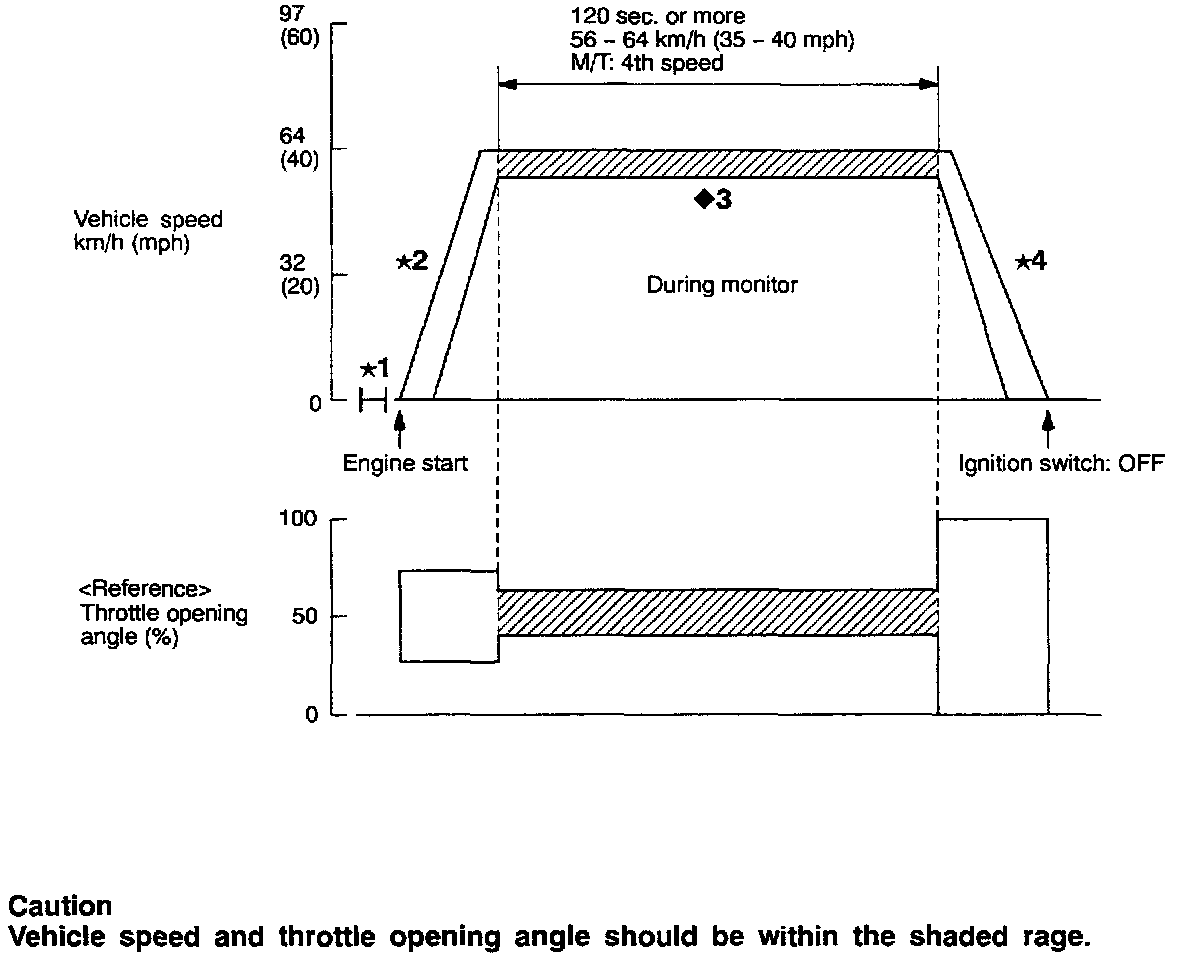 <>3: Drive between 56 and 64 km/h (35 and 40 mph) at a constant throttle angle (by not moving the throttle pedal as much as possible) for 120 seconds or more during monitor. Moreover, do not turn the steering wheel suddenly.