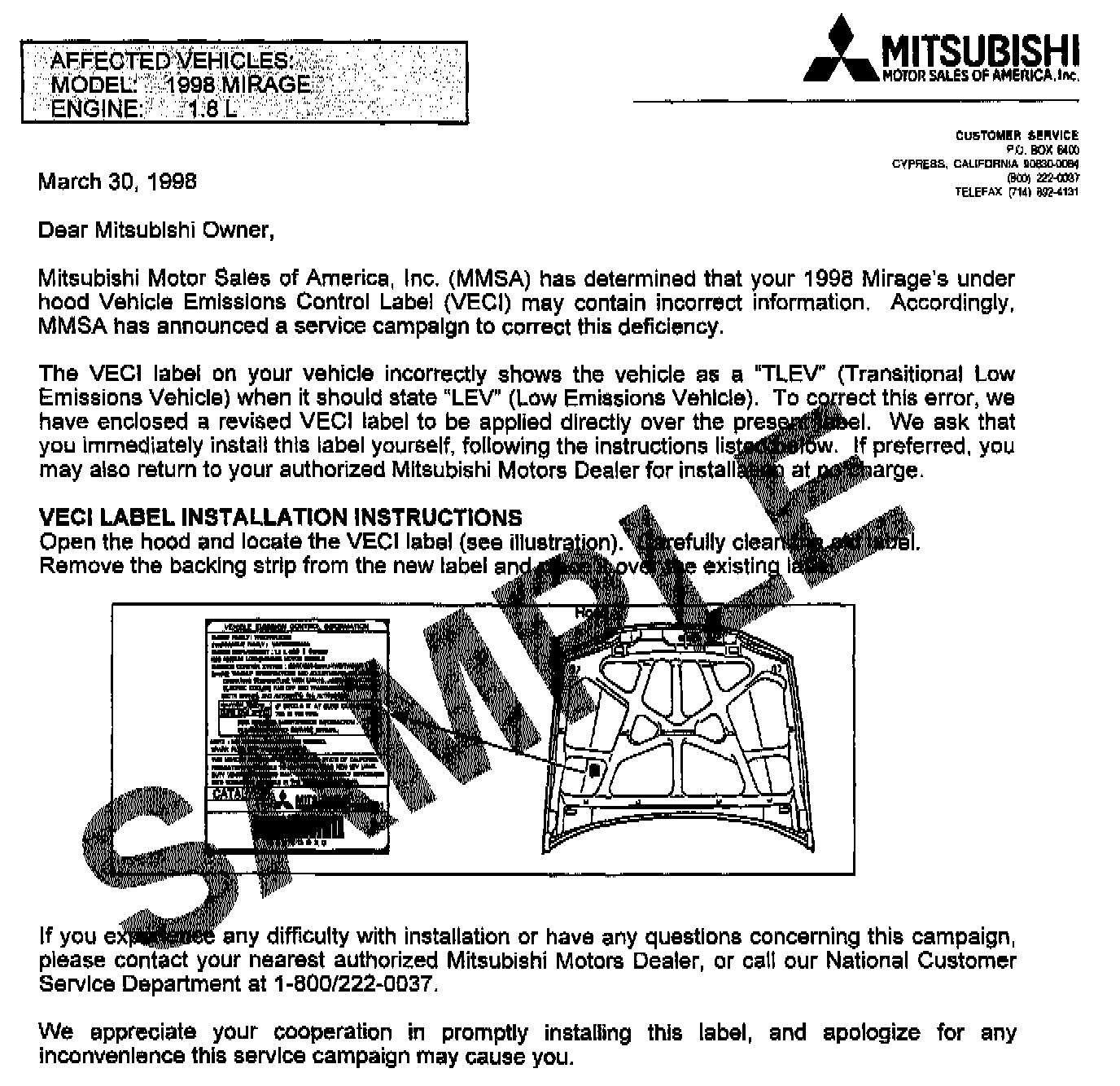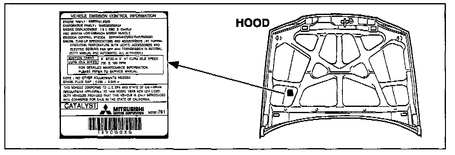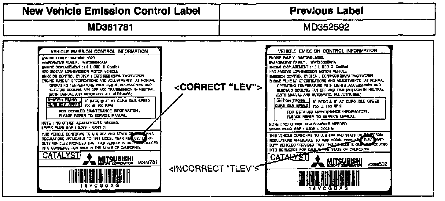 The Vehicle Emission Control Label (VECI) on a limited number of 1998 model year California emissions certified Mirage vehicles equipped with the 1.8L engine is incorrect and must be changed. A letter, with label enclosed, is being sent to all owners of affected vehicles instructing them to install the VECI label themselves. A copy of the customer notification letter is included with this bulletin. Vehicle owners who do not want to install the label are advised to ask their Mitsubishi Motors dealer to install the label at no charge.