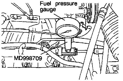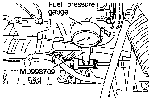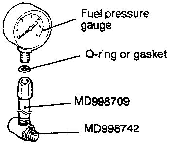 Use a suitable O-ring or gasket between the fuel pressure gauge and the special tool so as to seal in order to prevent fuel leakage at this time.