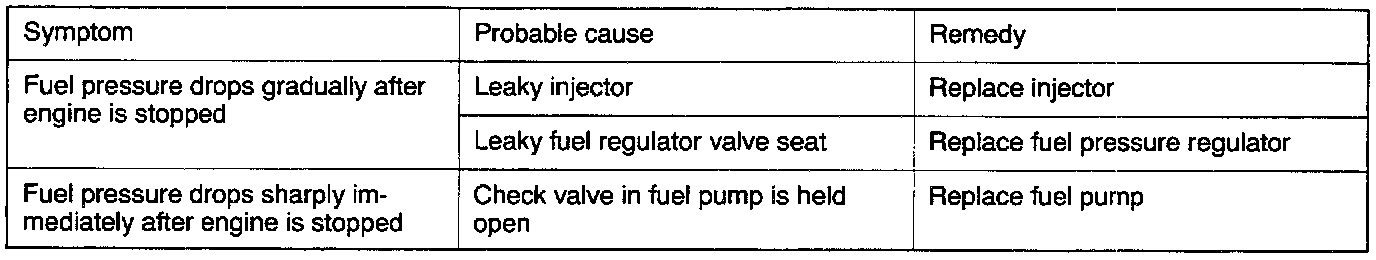 14. Stop the engine and observe fuel pressure gauge reading. Normal if the reading does not drop within 2 minutes. If it does, observe the rate of drop and troubleshoot and repair according to the table above.