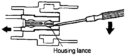 2. Insert the tip of the screwdriver [1.4 mm (.06 in.) or 2.0 mm (.08 in.) width] into the connector as shown in the figure raise the housing lance slightly with it, and pull out harness.