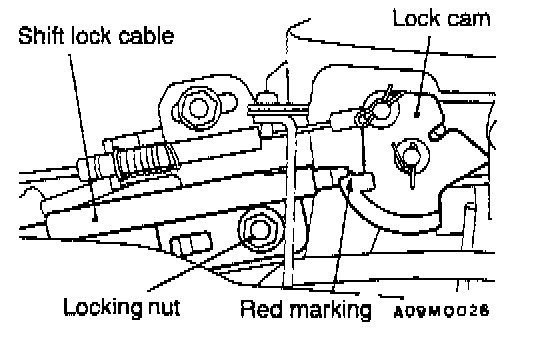 (4) Tighten the locking nut so that the end of the shift lock cable comes above the red marking of the lock cam.