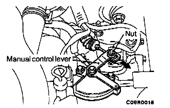 2. Loosen the adjusting nut, gently pull the transaxle control cable in the direction of the arrow and tighten the nut.