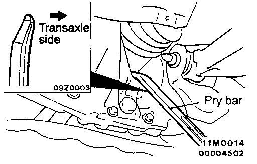 1. Insert a pry bar between the transaxle case and the drive shaft as shown to remove the drive shaft.