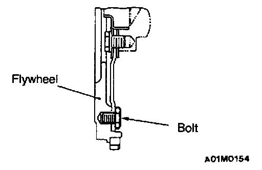 CAUTION: Do not remove the flywheel mounting bolt shown by the arrow. If this bolt is removed, the flywheel will become out of balance and damaged.