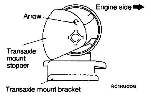 Install the transaxle mount stopper so that the arrow points as shown in the illustration.