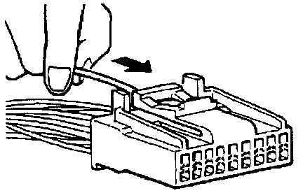 A connector that engages loosely can be repaired by removing the female terminal from the connector housing and raising its lance to establish securer engagement. Removal of the connector terminal used for MFI and ELC-4 A/T control circuit can be done in the following manner.1. Insert a screwdriver [1.4 mm (.06 in.) width] as shown in the figure, disengage front holder, and remove it.